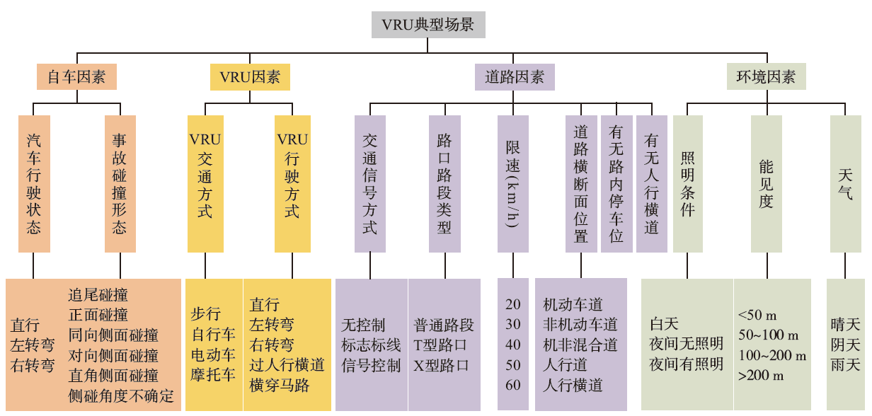 为了满足智能汽车避撞系统验证中高风险测试环境的需要,同时丰富面向弱势道路使用者(VRU)的自动驾驶场景评价内容和方法,该文通过对广西桂林市2016—2020年交通事故案例收集整理,筛选得到1 429例汽车与VRU碰撞事故数据;依据事故调查经验选取了13种风险因素,基于自组织K-means聚类分析构建了10类适用于中国城市交通状况的汽车与VRU碰撞的典型场景;利用信息熵理论建立了VRU典型场景复杂度评价模型,通过联合logistic模型与反向神经(BP)网络确定变量状态及各维度权重,计算得到各类场景复杂度;运用Guass混合模型对复杂度进行聚类,最终获得4个场景复杂度等级。 结果表明:在限速30 km/h的道路上,夜间直行汽车与横穿马路的电动自行车在非人行横道区域发生侧面碰撞的场景复杂度最高。该文的研究成果可为智能汽车安全性测试提供具备中国城市道路特征的实验场景,同时为车外VRU避撞方案和决策的制定提供一定的依据。
