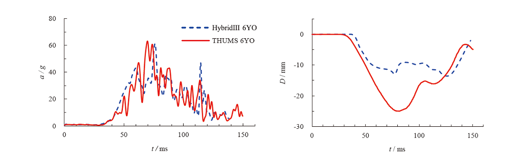 为厘清正面碰撞中6岁儿童乘员胸部损伤机理,基于ECE R129法规,选取某款儿童约束系统(CRS),对比Hybrid III 6YO 假人模型与THUMS 6YO人体有限元模型在正面碰撞中的运动学响应与损伤指标的差异;用Hybrid III 6YO假人模型,建立胸部动力学方程,分析正碰中内外力对胸部加速度的影响;对THUMS 6YO人体有限元模型的肋骨、心脏和肺部的应变进行分析,得出儿童乘员的胸部损伤风险。结果表明:Hybrid III 6YO假人模型所受到的颈部力与安全的肩带力对胸部加速度的影响较大。THUMS 6YO人体有限元模型的胸部质心合成加速度52.1g,Hybrid III 6YO假人模型的加速度38.8g,两者均低于法规规定的参考数值。