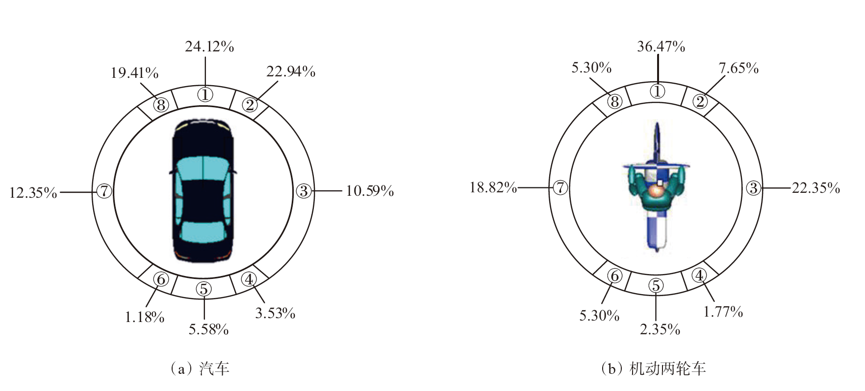 | 2 | 15、20、25、30 | 15、20、25、30 | 汽车碰撞摩托车前部、中部、后部 |