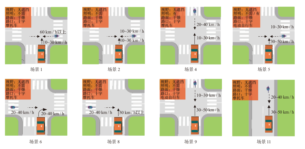 | 5 | 无遮挡 | 十字路口 | 干燥 | 不需/有 | 左、右侧 | 直行 | 摩托车 | 10~30 | 直行 | 30~50 | 20.0 | |