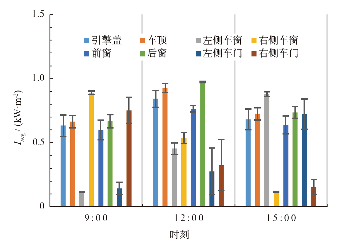 Vehicle integrated photovoltaic(VIPV) can effectively reduce the dependence of vehicles on fossil fuels, help to reduce carbon dioxide emissions, and it is an important measure to promote the development of sustainable transportation. The irradiance of the whole vehicle was analyzed, and the annual cumulative radiation of the vehicle was calculated for evaluating the solar energy resources of the whole vehicle and optimizing the design of the integrated photovoltaic system on the vehicle. Based on the triangular mesh surface model, the global horizontal irradiance of a static vehicle at a specific time and position was calculated according to Kasten Clear Sky model, and then the direct normal irradiance on the inclined surface was analyzed by using the ray-casting algorithm in 3D space, and the diffuse irradiance was calculated combined with Perez model. Finally, the global irradiance on each triangular mesh and the irradiance distribution of the whole vehicle was obtained. The radiation energy of the vehicle in different regions and different driving conditions was also calculated and analyzed, providing a reference for the fine design of the vehicle efficient photovoltaic system. The result shows that the irradiance of different parts of the car is greatly different, the cumulative radiation energy throughout the year of the hood, the roof, the front and rear windshields, the left and right sides of the car and the windows varies from 15.8% to 42.5%, and the average radiation energy of the car is about 75% of the horizontal plane, and the difference of radiation energy is not more than 5% when the car is in different orientations.